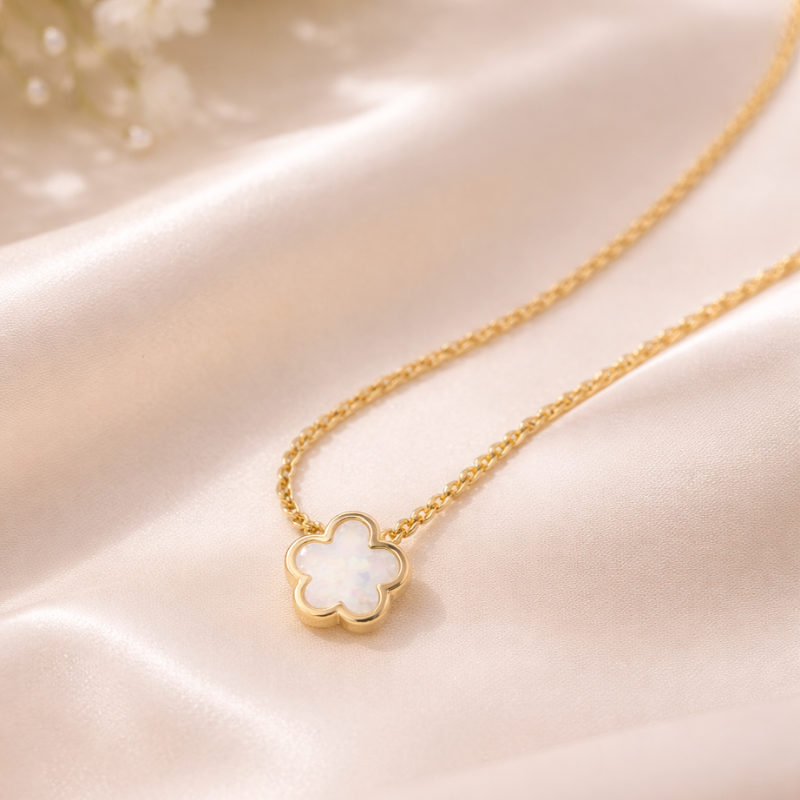 Das filigrane Kleeblatt aus schimmerndem Perlmutt fängt das Licht auf besonders elegante Weise ein und symbolisiert Glück und Harmonie.