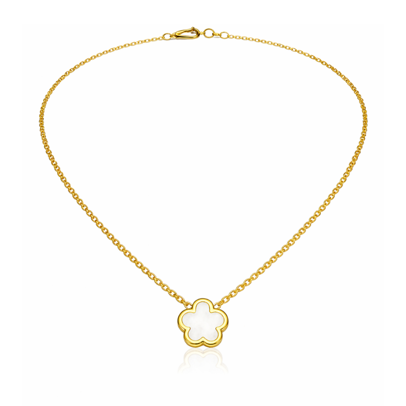 Die Clover Halskette in Perlmutt White in 18 Karat Vergoldung kombiniert edle Materialien mit einem Hauch von Luxus.