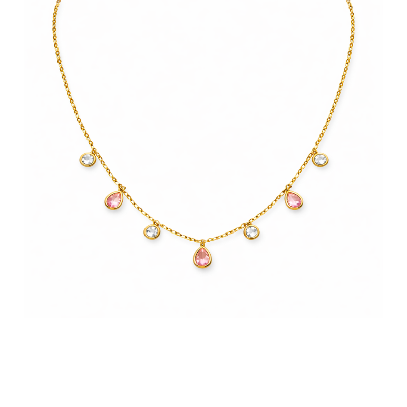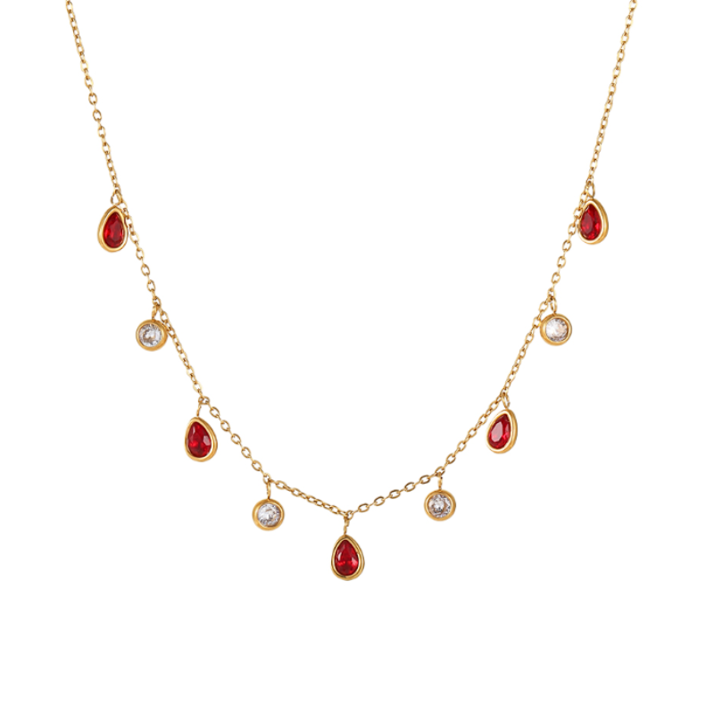 Diese bezaubernde Halskette aus der Bridgerton Kollektion vereint romantische Raffinesse mit aristokratischer Eleganz. Zarte, goldfarbene Kettenglieder tragen fein gefasste tropfenförmige bunte Steine, die an rubinrote Juwelen aus den Salons der Londoner High Society erinnern. Funkelnde klare Akzente sorgen für ein harmonisches Spiel aus Licht und Farbe.