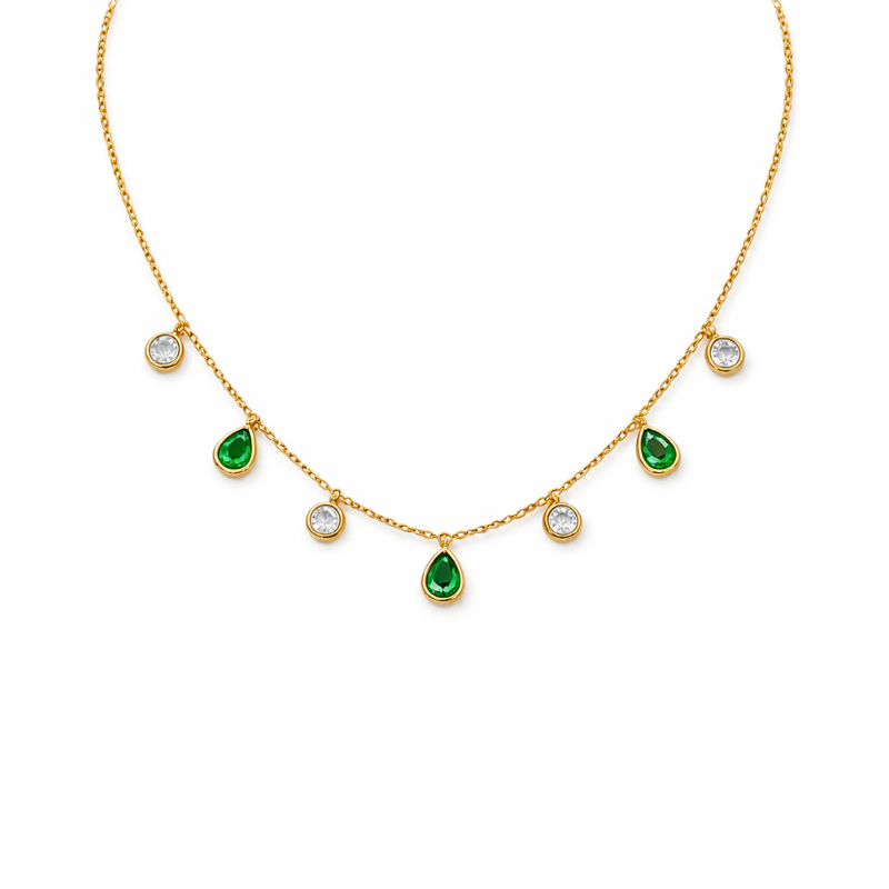 Die sanft fallende Anordnung der Steine verleiht der Kette eine besonders feminine Silhouette und lässt sie elegant am Dekolleté liegen. Inspiriert von der prachtvollen Ästhetik der Regency-Epoche ist dieses Schmuckstück die perfekte Wahl für festliche Anlässe, romantische Abende oder als luxuriöses Highlight im Alltag.