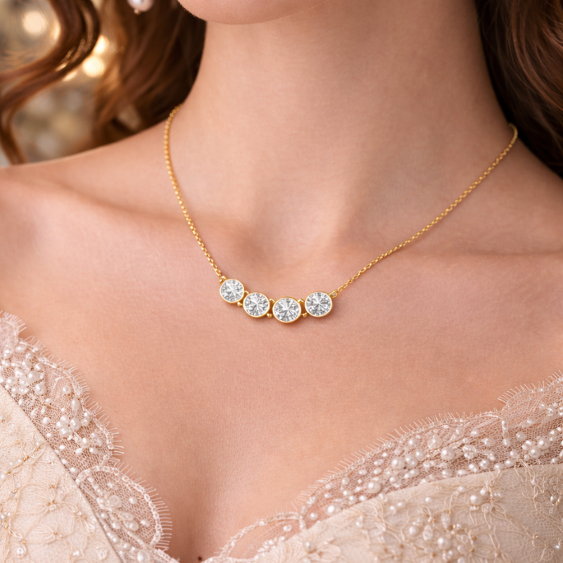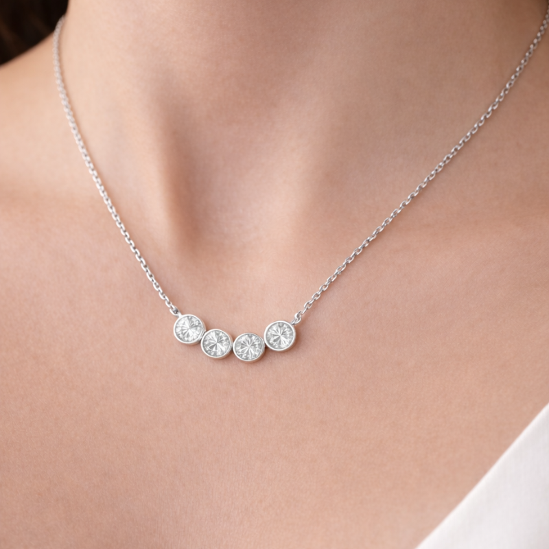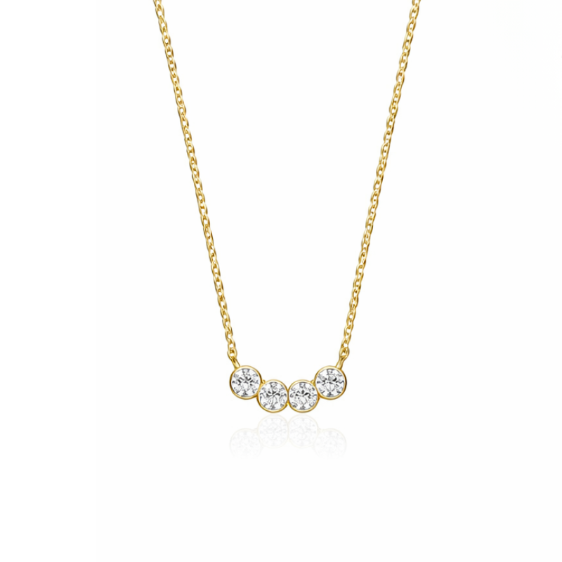 Fünf funkelnde, rund geschliffene Steine sind in edlen Zargenfassungen harmonisch aneinandergereiht und schmiegen sich sanft an das Dekolleté. Die filigrane Kette unterstreicht die Leichtigkeit des Designs und lässt das Collier sowohl tagsüber als auch am Abend erstrahlen.
